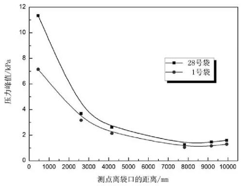 1號濾袋到28號濾袋分別在如圖4所示的離濾袋口455mm、2615mm、4165mm、7815mm、9165mm、9945mm位置布置測試點安裝壓力傳感器。實驗得出:壓力峰值的*大值都出現(xiàn)在第1個測點處(距濾袋口455mm),壓力峰值的*小值都出現(xiàn)在第4個測點處(距濾袋口7815mm);從第1個測點到第4個測點,壓力峰值逐漸減小,從第4個測點到第6個測點,壓力峰值逐漸增大,因此從濾袋口至下,壓力越來越小,直到底部,氣體積壓,壓力略微上升。28個濾袋上形成的壓力分布整體趨勢基本是一致的,從第1號濾袋至第28號濾袋壓力值有增大趨勢,圖5為1號、28號濾袋壓力分布曲線對比圖,這和噴吹管上壓力分布沿氣流方向逐漸增大的趨勢是一致的。