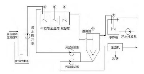 (2)將脫硫廢水加藥系統(tǒng)接一路至事故漿液箱,廢水在事故漿液箱內(nèi)進行中和、凝聚、絮凝。
