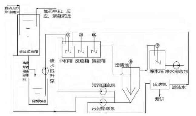 (4)壓濾機的濾液水接至三聯(lián)箱,經(jīng)澄清池再次沉淀*終排出。