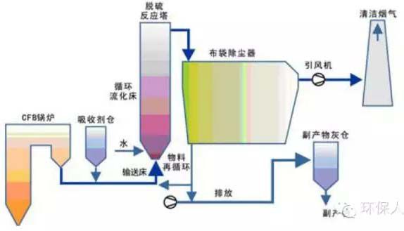 以循環(huán)流化床原理為基礎,通過物料的循環(huán)利用,在反應塔內吸收劑、吸附劑、循環(huán)灰形成濃相的床態(tài),并向反應塔中噴入水,煙氣中多種污染物在反應塔內發(fā)生化學反應或物理吸附;經反應塔凈化后的煙氣進入下游的除塵器,進一步凈化煙氣。此時煙氣中的SO2和幾乎全部的SO3,HCl,HF等酸性成分被吸收而除去,生成CaSO3•1/2H2O、CaSO4•1/2H2O等副產物。