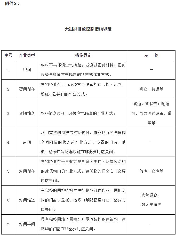 全面加強(qiáng)無(wú)組織排放管理。嚴(yán)格控制工業(yè)爐窯生產(chǎn)工藝過(guò)程及相關(guān)物料儲(chǔ)存、輸送等無(wú)組織排放,在保障生產(chǎn)安全的前提下,采取密閉、封閉等有效措施(見(jiàn)附件5),有效提高廢氣收集率,產(chǎn)塵點(diǎn)及車間不得有可見(jiàn)煙粉塵外逸。生產(chǎn)工藝產(chǎn)塵點(diǎn)(裝置)應(yīng)采取密閉、封閉或設(shè)置集氣罩等措施。煤粉、粉煤灰、石灰、除塵灰、脫硫灰等粉狀物料應(yīng)密閉或封閉儲(chǔ)存,采用密閉皮帶、封閉通廊、管狀帶式輸送機(jī)或密閉車廂、真空罐車、氣力輸送等方式輸送。粒狀、塊狀物料應(yīng)采用入棚入倉(cāng)或建設(shè)防風(fēng)抑塵網(wǎng)等方式進(jìn)行儲(chǔ)存,粒狀物料采用密閉、封閉等方式輸送。物料輸送過(guò)程中產(chǎn)塵點(diǎn)應(yīng)采取有效抑塵措施。